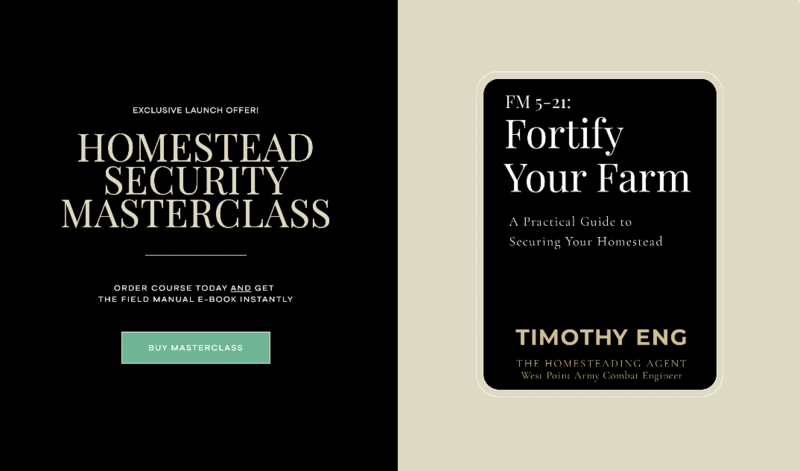 In this Homestead Security Masterclass, you'll learn practical strategies, techniques, and insights derived from both permaculture principles and military engineering experience from Tim. In this bundle, you will also receive the digital version of Tim's book, "FM 5-21: Fortify Your Farm: A Practical Guide to Securing Your Homestead"